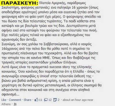 “Παρασκευή. Πλατεία Αμερικής, παράδρομος Σκαλιστήρη, φούρνος γειτονιάς: ένα παλικάρι 16 χρονών (όπως αποδείχθηκε αργότερα) μπαίνει μέσα και ευγενικά ζητάει από τον φούρναρη κάτι να φάει γιατί έχει μέρες.