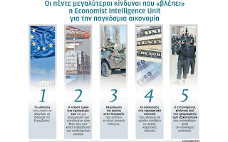 Το ενδεχόμενο εξόδου της Ελλάδας από το ευρώ με πιθανότατο συνεπακόλουθο τη διάλυση της Ευρωζώνης εξακολουθεί να θεωρεί τον μεγαλύτερο κίνδυνο για την κερδοφορία των επιχειρήσεων και γενικότερα για την παγκόσμια οικονομία η Economist Intelligence Unit, μονάδα ερευνών του ομίλου Economist.