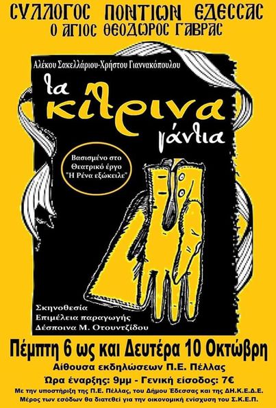 Υπό την αιγίδα του Συλλόγου Ποντίων Έδεσσας, από σήμερα 6 Οκτωβρίου μέχρι την Δευτέρα 10 Οκτωβρίου, ανεβαίνει το θεατρικό έργο “Τα κίτρινα γάντια”, που είναι από τις κλασσικές ταινίες του ελληνικού κινηματογράφου.