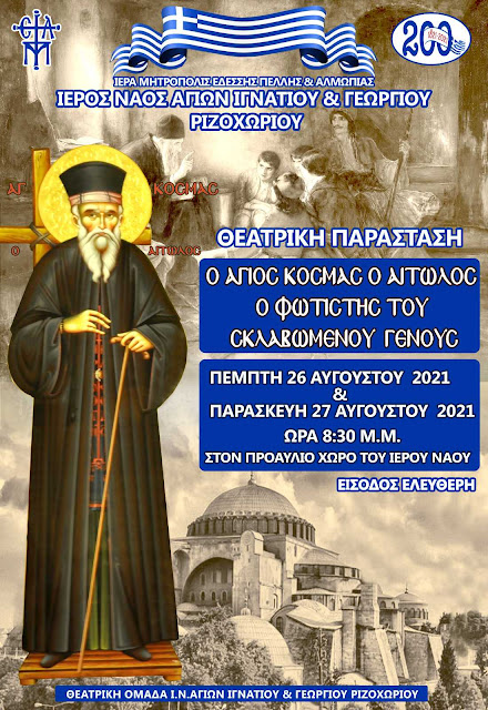 Η Θεατρική ομάδα της ενορίας Αγίων Ιγνατίου και Γεωργίου Ριζοχωρίου Αριδαίας παρουσιάζει την θεατρική παράσταση με τίτλο: Ο ΑΓΙΟΣ ΚΟΣΜΑΣ Ο ΑΙΤΩΛΟΣ Ο ΦΩΤΙΣΤΗΣ ΤΟΥ ΣΚΛΑΒΩΜΕΝΟΥ ΓΕΝΟΥΣ.
