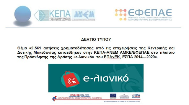 Θέμα «2.561 αιτήσεις χρηματοδότησης από τις επιχειρήσεις της Κεντρικής και Δυτικής Μακεδονίας κατατέθηκαν στην ΚΕΠΑ-ΑΝΕΜ ΑΜΚΕ/ΕΦΕΠΑΕ στο πλαίσιο της Πρόσκλησης της Δράσης «e-λιανικό» του ΕΠΑνΕΚ, ΕΣΠΑ 2014—2020».
