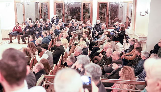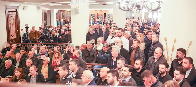 κατάμεστη αίθουσα του Ξενοδοχείου «Πέλλα» στα Γιαννιτσά ο Θεόδωρος Θεοδωρίδης