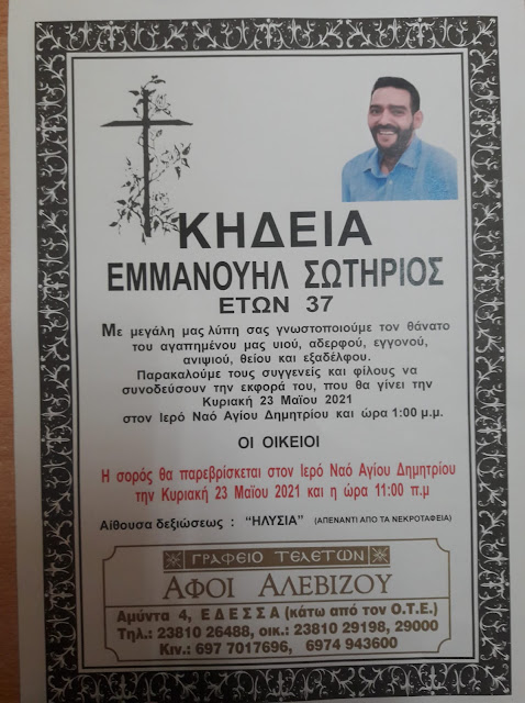 Μια δύσκολη μέρα, ξημέρωσε σήμερα για την Έδεσσα, καθώς έχασε τη μάχη με τη ζωή, ένας νέος άνθρωπος. Πρόκειται για τον Σωτήρη Εμμανουήλ 37 ετών, γνωστό επιχειρηματία. Ο ίδιος διατηρούσε κατάστημα μίνι μάρκετ επί της οδού Εναντίας στην Έδεσσα. Δυστυχώς χάνουμε τα καλύτερα παιδιά κρίμα και άδικο. Πολύ κρίμα… Ας είναι ελαφρύ το χώμα που τον σκεπάζει!!!