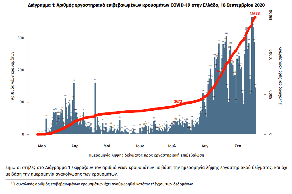 Ειδικότερα, σύμφωνα με ανακοίνωση του Εθνικού Οργανισμού Δημόσιας Υγείας (ΕΟΔΥ), ο συνολικός αριθμός των κρουσμάτων είναι 14.738, εκ των οποίων το 55.7% άνδρες.
