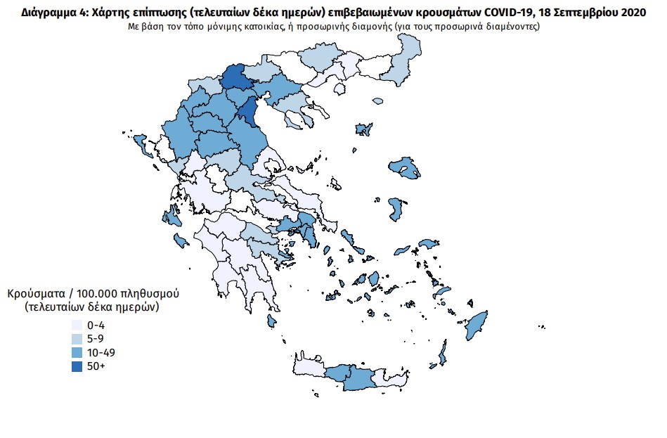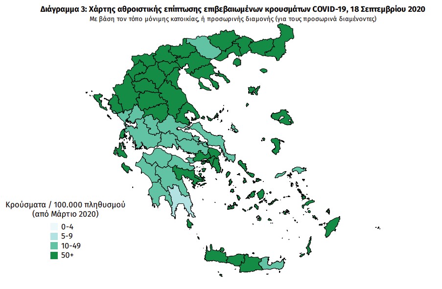 Ο χάρτης αποτυπώνει τη γεωγραφική κατανομή των συνολικών κρουσμάτων COVID-19 (από την αρχή της επιδημίας) ανά Περιφερειακή Ενότητα της χώρας, με βάση την δηλωθείσα διεύθυνση μόνιμης κατοικίας του ασθενούς, ή τη διεύθυνση προσωρινής διαμονής για τους τουρίστες και άλλους προσωρινά διαμένοντες στην Ελλάδα.