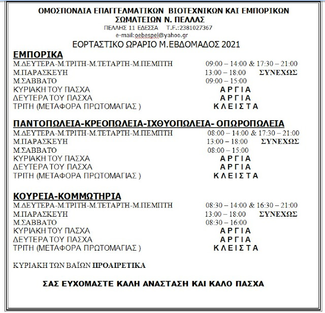 και Εμπορικών Σωματείων Ν. Πέλλας σας ενημερώνει  για το εορταστικό ωράριο της