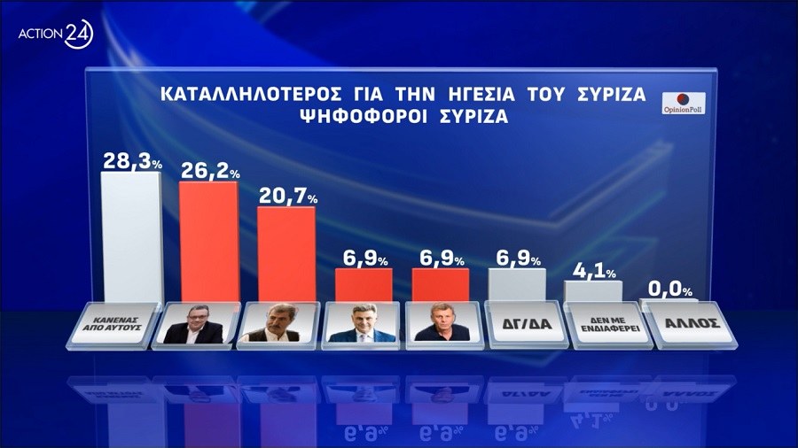 Με 26,2% έναντι 20.7% προηγείται ο Σωκράτης Φάμελλος του Παύλου Πολάκη ενόψει του πρώτου γύρου της εκλογής στον ΣΥΡΙΖΑ, μετά τον αποκλεισμό του Στέφανου Κασσελάκη, ωστόσο ενδιαφέρον έχει τοποσοστό 28,3% που συγκεντρώνει η επιλογή «Κανένας από αυτούς». Ακολουθούν με 6,9% τόσο ο Νικόλας Φαραντούρης, όσο και ο Απόστολος Γκλέτσος. Επιπλέον, μόλις ένας στους τρεις ψηφοφόρους εκτιμά ότι το κόμμα θα έχει ανοδική πορεία στο μέλλον. Μάλιστα, μεταξύ των ψηφοφόρων του ΣΥΡΙΖΑ, μόνον το 27% θεωρούν ότι ο Στέφανος Κασσελάκης είναι η βασική αιτία για την κρίση στο κόμμα.