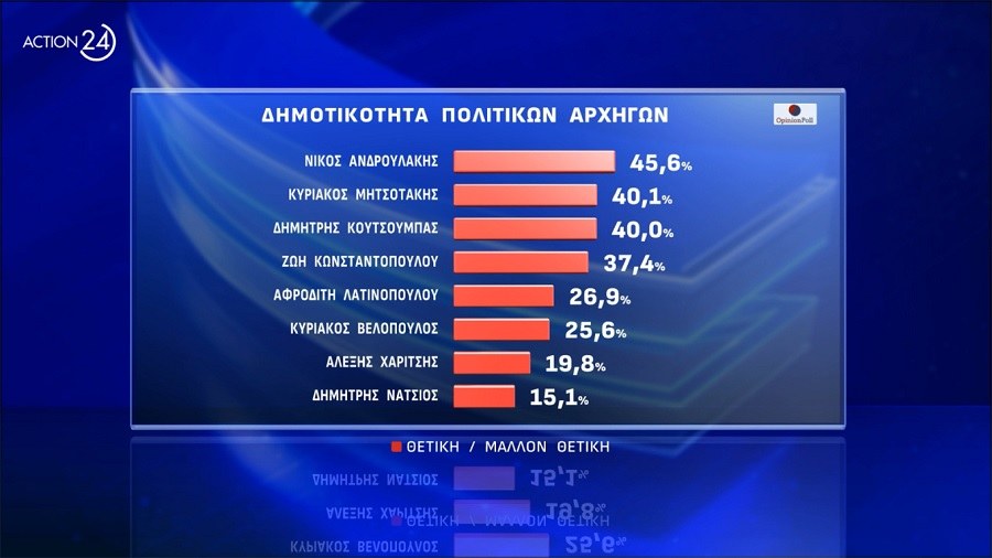 Επίσης, μπορεί ο Κυριάκος Μητσοτάκης να είναι πρώτος στην καταλληλότητα για πρωθυπουργός όμως ο Νίκος Ανδρουλάκης έρχεται πρώτος στη δημοτικότητα με 45,6%.