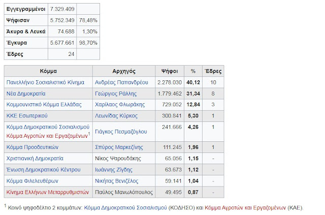 Το Πανελλήνιο Σοσιαλιστικό Κίνημα με 48,07% κατέλαβε 172 έδρες, η Νέα Δημοκρατία με 35,88% των ψήφων κατέλαβε 115 έδρες και το Κομμουνιστικό Κόμμα Ελλάδας με 10,93% 13 έδρες. Τα υπόλοιπα κόμματα που συμμετείχαν, δεν κατάφεραν να εκλέξουν κανένα βουλευτή.