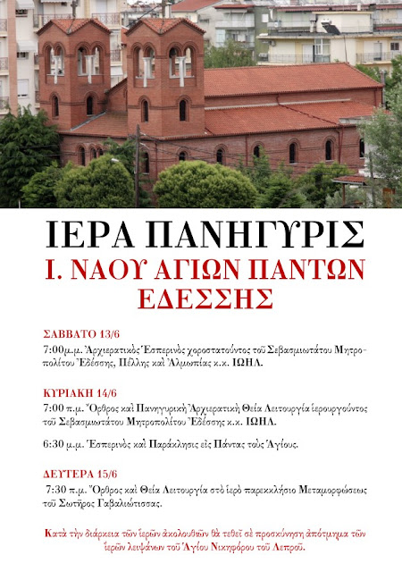 Την Κυριακή 14 Ιουνίου, εορτή των Αγίων Πάντων, πανηγυρίζει ο ιερός ενοριακός ναός Αγίων Πάντων Εδέσσης.
