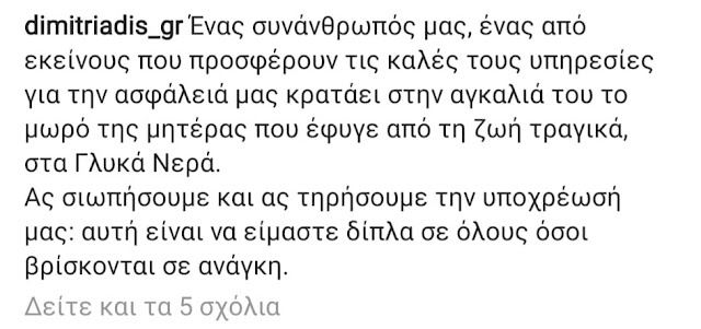 Την δική του στήριξη στο μωρό, την Ελληνική Αστυνομία αλλά και τον αποτροπιασμό του για το στυγερό έγκλημα στα Γλυκά Νερά Κορίνθου, εξέφρασε με ανάρτηση του στο Istagram, ο Διευθυντής του Πρωθυπουργικού γραφείου, Γρηγόρης Δημητριάδης. Μάλιστα ο ίδιος ζήτησε να υπάρξει σιωπή ως φόρος ύψιστης μνήμης για την γυναίκα που έφυγε.