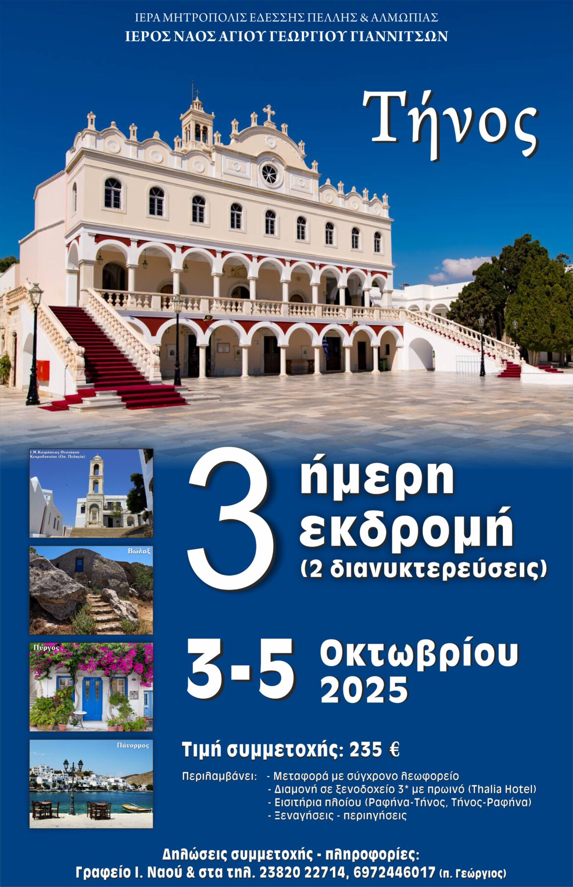 Η ενορία Αγίου Γεωργίου Γιαννιτσών διοργανώνει με την ευλογία της Ιεράς Μητροπόλεως Εδέσσης, Πέλλης και Αλμωπίας τριήμερη εκδρομή, από 3 έως 5 Οκτωβρίου, με επίκεντρο τα ιερά προσκυνήματα της Τήνου, στο νησί της Μεγαλόχαρης. Θα πραγματοποιηθούν επισκέψεις στους εξής προορισμούς: