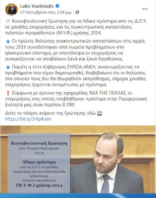 Κοινοβουλευτική Ερώτηση για τα Άδικα πρόστιμα από τις Δ.Ο.Υ. σε χιλιάδες επιχειρήσεις για τις συγκεντρωτικές καταστάσεις πελατών-προμηθευτών (Μ.Υ.Φ.) χρήσης 2014 κατέθεσε ο Βουλευτής της ΝΔ Λάκης Βασιλειάδης. Είναι το ζήτημα που είχε φέρει στην επικαιρότητα, για πρώτη φορά, η καθημερινή μας εφημερίδα Νέα της Πέλλας. Τελικά και ο ίδιος ο Βουλευτής κατέθεσε ερώτηση για αυτό το ζήτημα που αφορά επιχειρήσεις της Πέλλας και την δημοσιοποίησε το προηγούμενο Σάββατο.