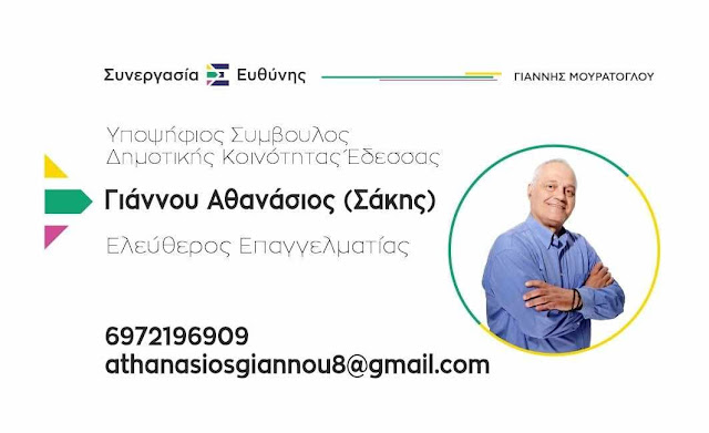 Ο Σάκης Γιάννου, έχοντας μάθει αρκετά, όλα αυτά τα χρόνια, και με την λογική του άριστου γνωστή της αγοράς της Εδεσσας, θέλει να δοκιμαστεί ( για πρώτη φορά) στον πολιτικό στίβο, βάζοντας υποψηφιότητα στην Δημοτική Κοινότητα Έδεσσας με τον συνδυασμό του Γιάννη Μουράτογλου.